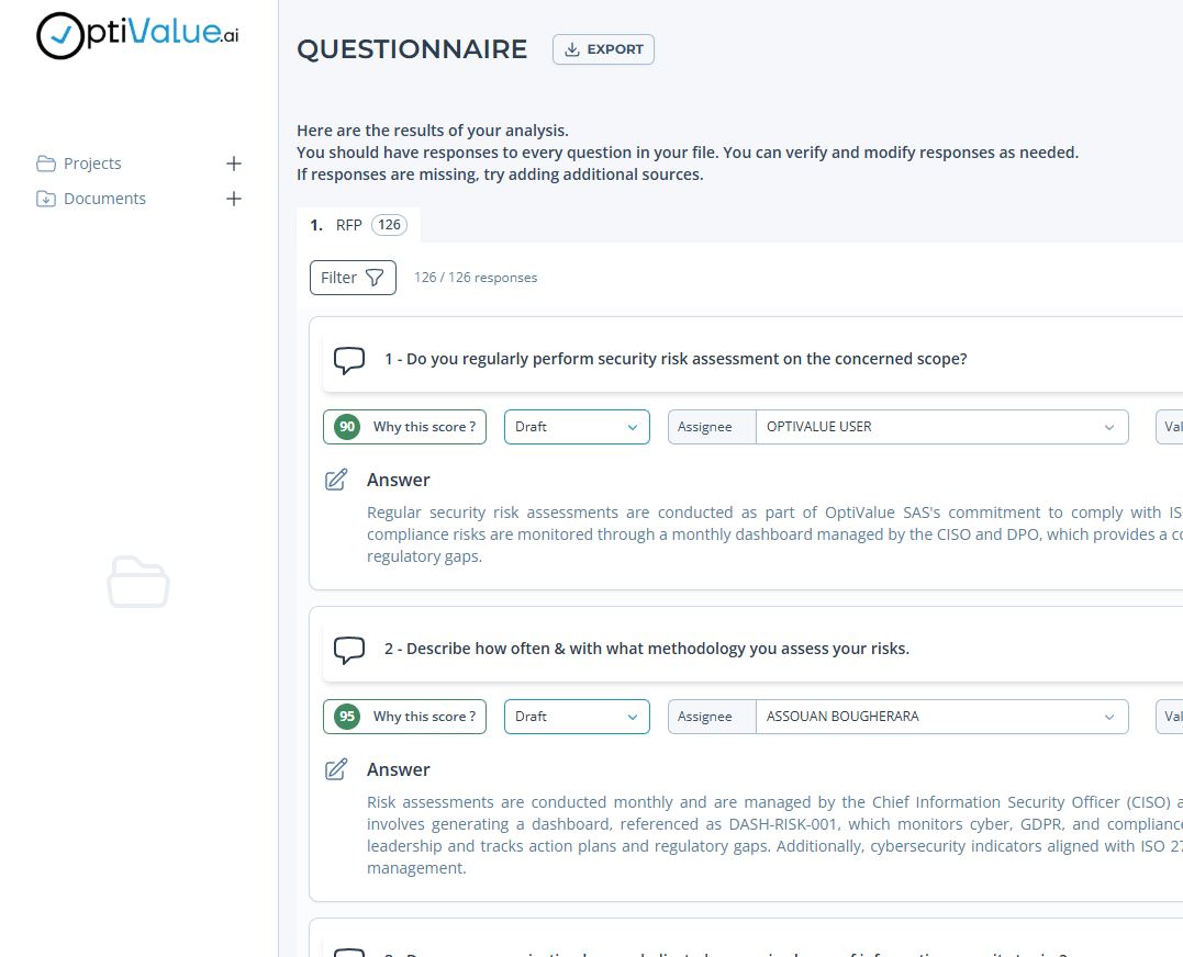 Immediately assess the compliance of your answers with a clear score. - Optimized documents, effortlessly. OptiValue.ai Learn from your teams. Your teams learn from OptiValue.ai. Your content is improving naturally and continuously.